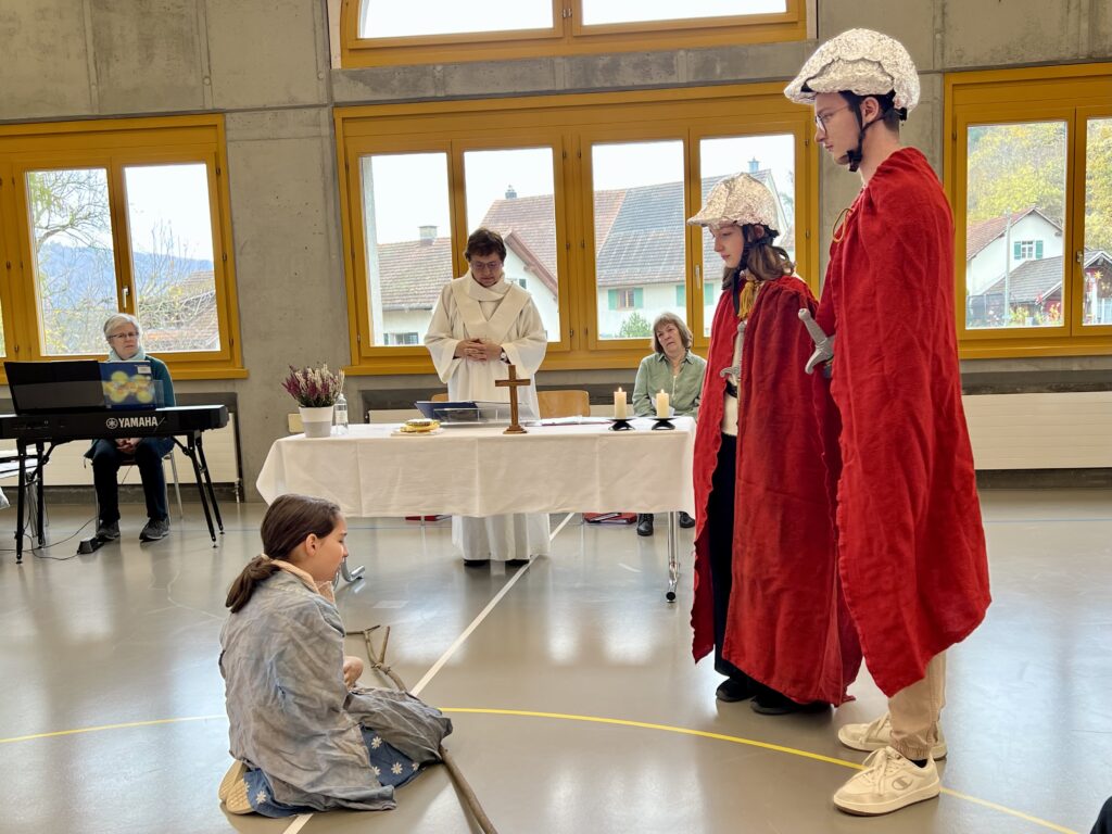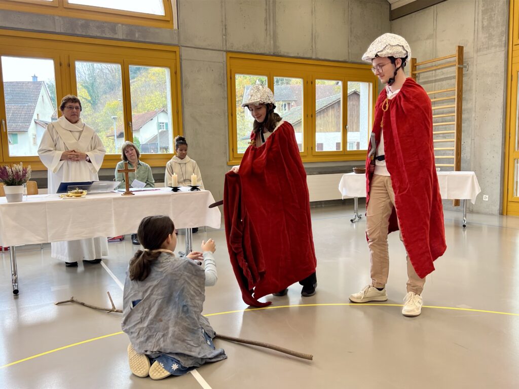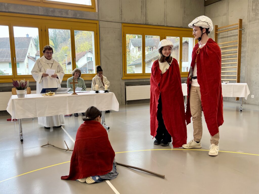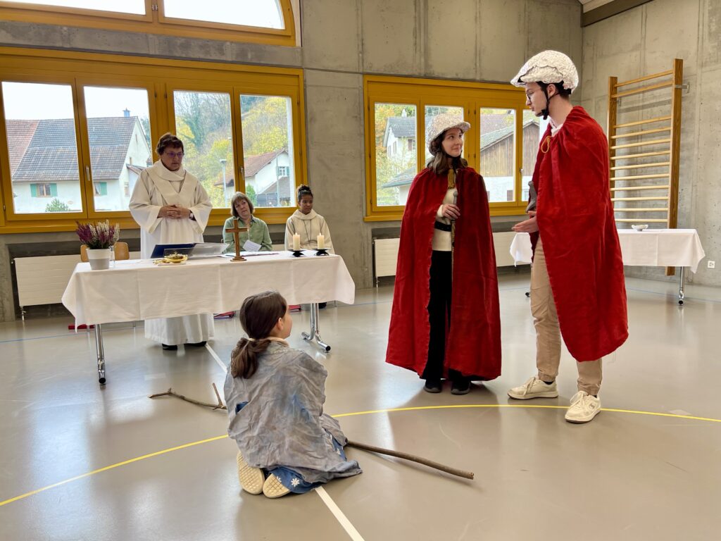 Ein besonderer Höhepunkt war die lebendige Darstellung der Martinsgeschichte durch die Ministrantinnen und Ministranten aus Bad Zurzach. Mit viel Engagement spielten sie die bekannte Szene nach, in der Martin seinen Mantel mit einem frierenden Bettler teilt. Begleitet wurde das Spiel von kräftigen Gesängen der Gemeinde.