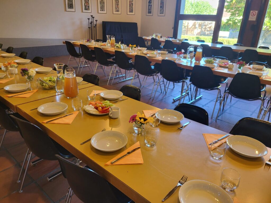 Währenddessen bereiteten Brigitte Andres, Sr. Ursula und Ottilia Moglan liebevoll das Mittagessen vor – mit schön gedeckten Tischen und einem Menü, das großen Applaus und noch größeren Appetit hervorrief.