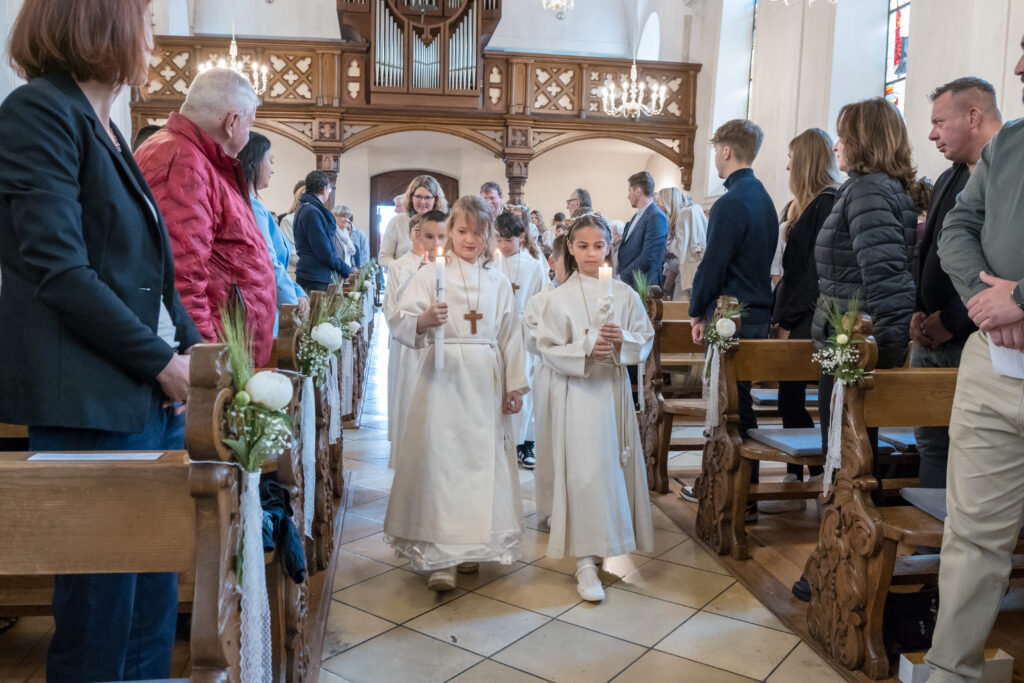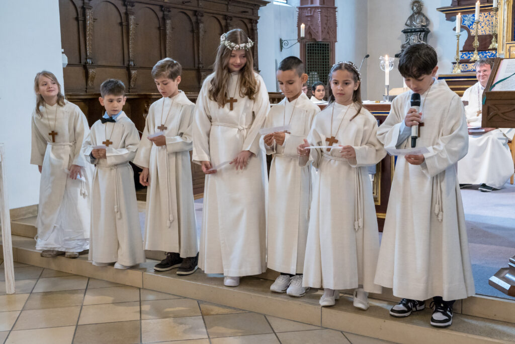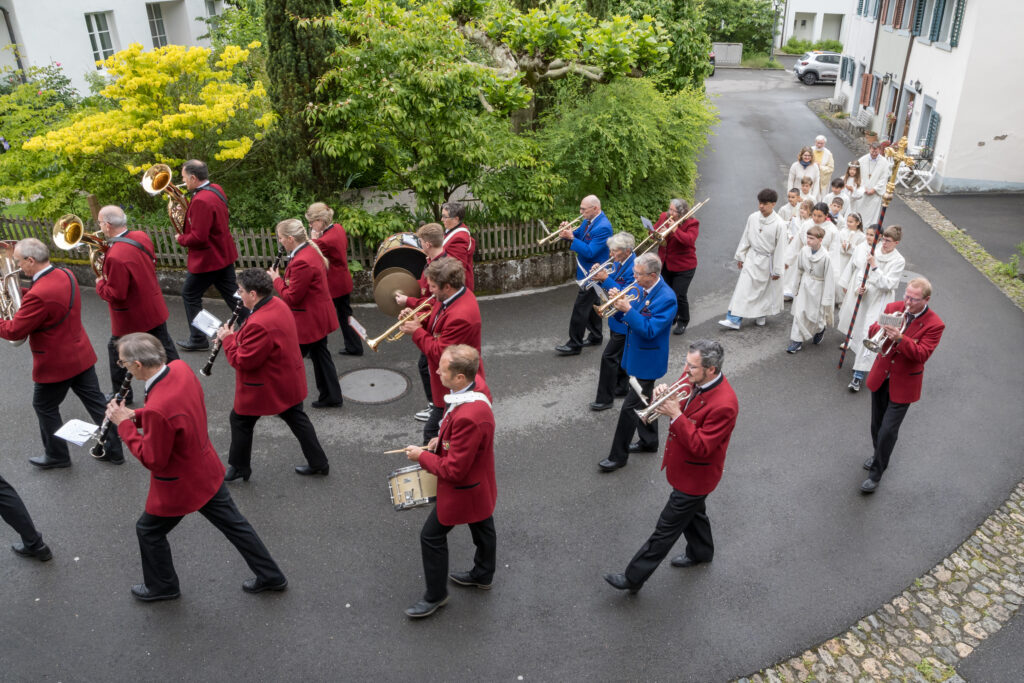 Am Sonntag, 25. Mai war der grosse Tag. Mit den Klängen der Spielvereinigung Kaiserstuhl-Hohentengen zogen die sieben Erstkommunionkinder, begleitet von Ministranten, Katechetin Susanne Meyer, Pfarreiseelsorger Stefan Günter und Pfarrer Bernhard Ollmer zur Stadtkirche St. Katharina, wo sie von einer grossen Festgemeinde empfangen wurden.