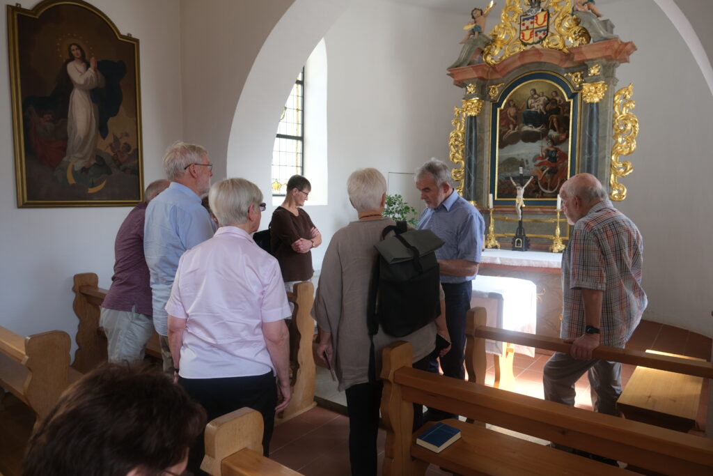 Arthur Vögele fungierte somit als Tourguide und zeigte als erstes die Hettenschwiler Kapelle aus dem Jahre 1642. Anfang des 17. Jahrhunderts wütete in Europa die Pest; damals sicher mit ein Grund, um die Kapelle den Heiligen Sebastian und Rochus zu weihen, die beide bei Seuchen und ansteckenden Krankheiten angerufen werden. Die Kapelle ist sehenswert und dient heutzutage vor allem der Einkehr. Das Altarbild mit dem geschnitzten Holzaufbau, die beiden seitlichen Gemälde und das übergrosse Bild an der Rückwand verschönern den sakralen Raum. Eine Anekdote: Anlässlich der Innenrenovation von 1972 rettete das ehemalige Sigristenpaar Ida und Arthur Vögele, die Eltern unseres Präsidenten, die farbigen ausgebauten Kapellenfenster mit den Glasmalereien vor ihrer Zerstörung und bewahrte sie jahrzehntelang in der eigenen Scheune auf. Bei der nächsten Renovation rund 35 Jahre später wurden sie fachgerecht restauriert und wieder eingesetzt.