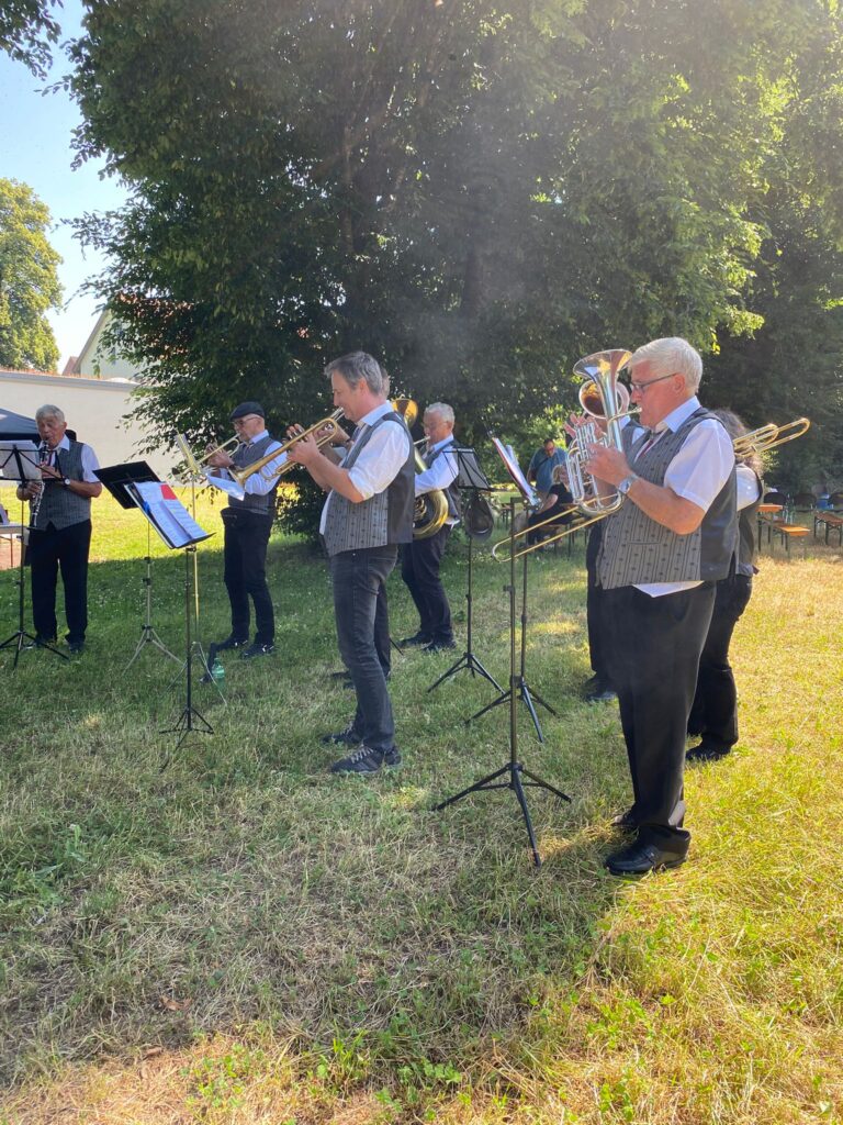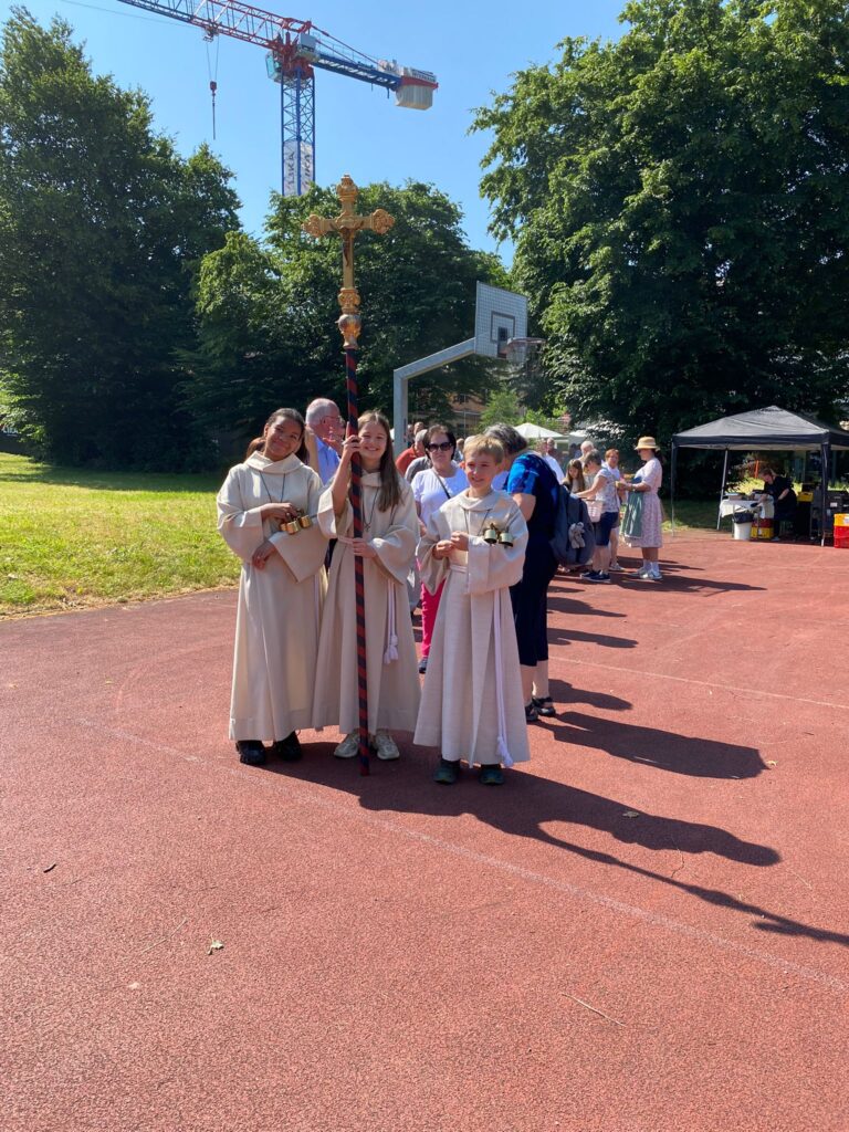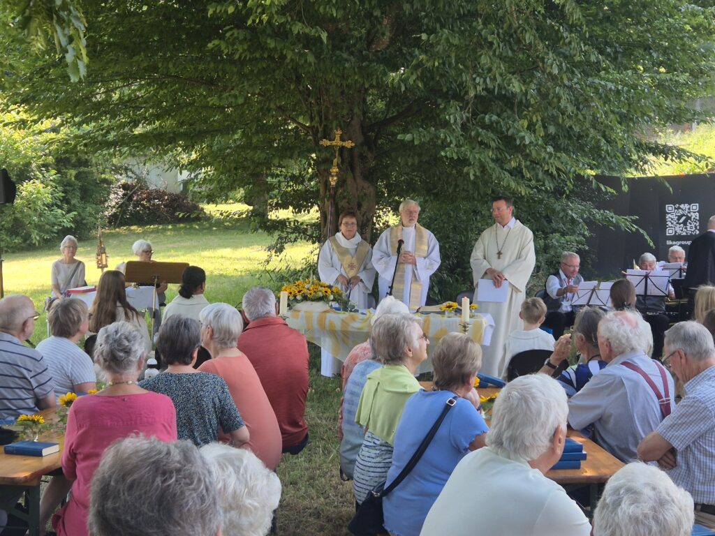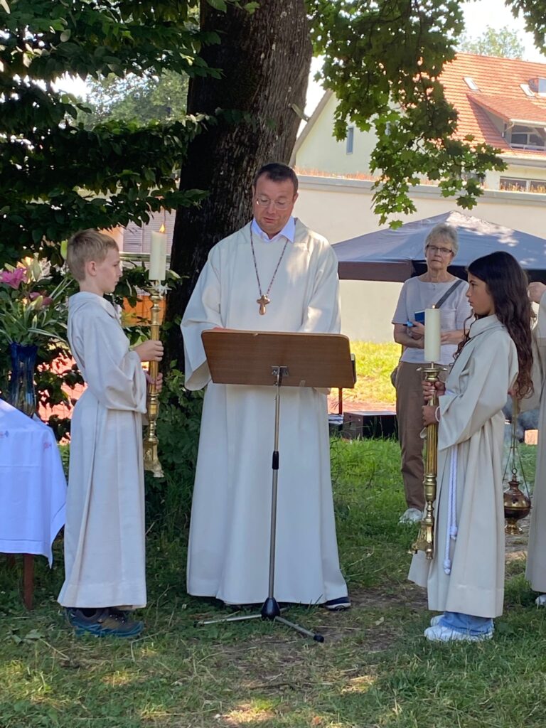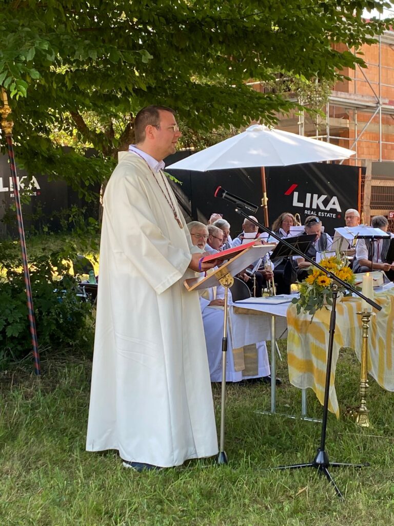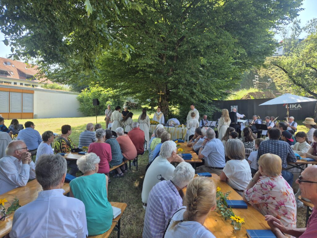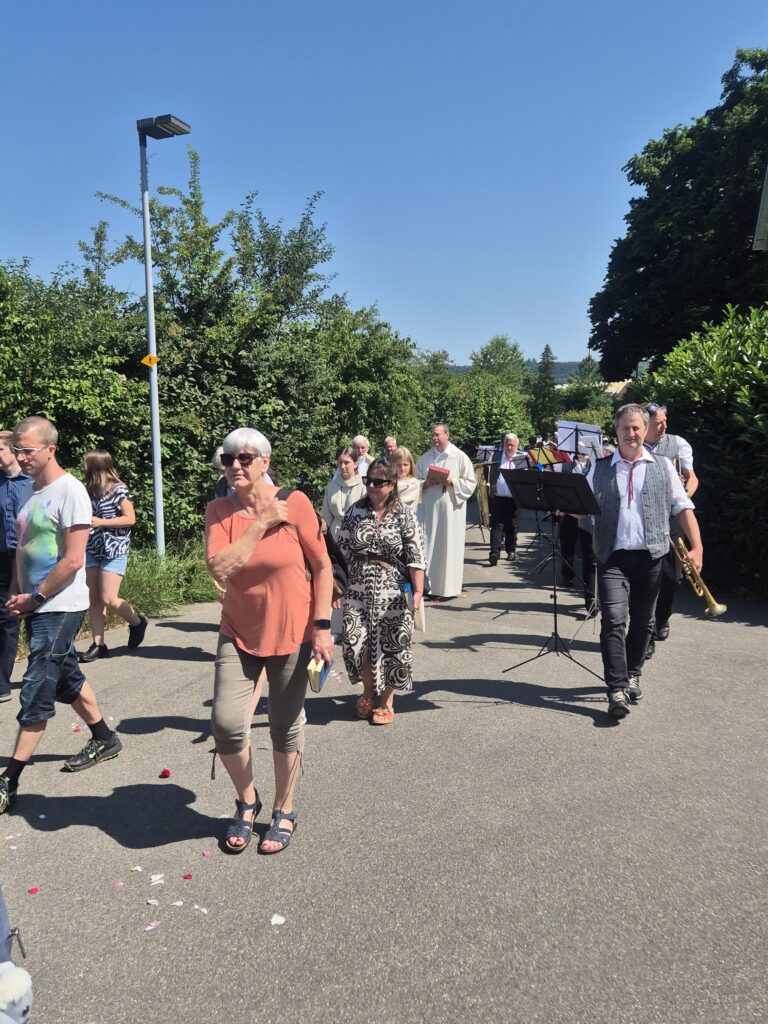 In diesem Jahr durfte Fronleichnam an einem sonnigen, heissen Tag gefeiert werden, und so konnte der Pastoralraumgottesdienst draussen vor dem Schulhaus Chilewies in Fisibach unter schattenspendenden Bäumen stattfinden. Musikalisch wurde der Gottesdienst von den Eglisauer Stadtbergmusikanten umrahmt.