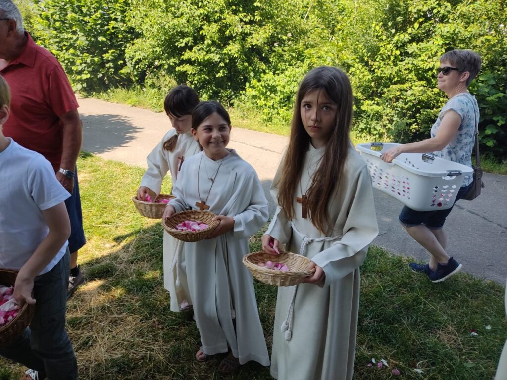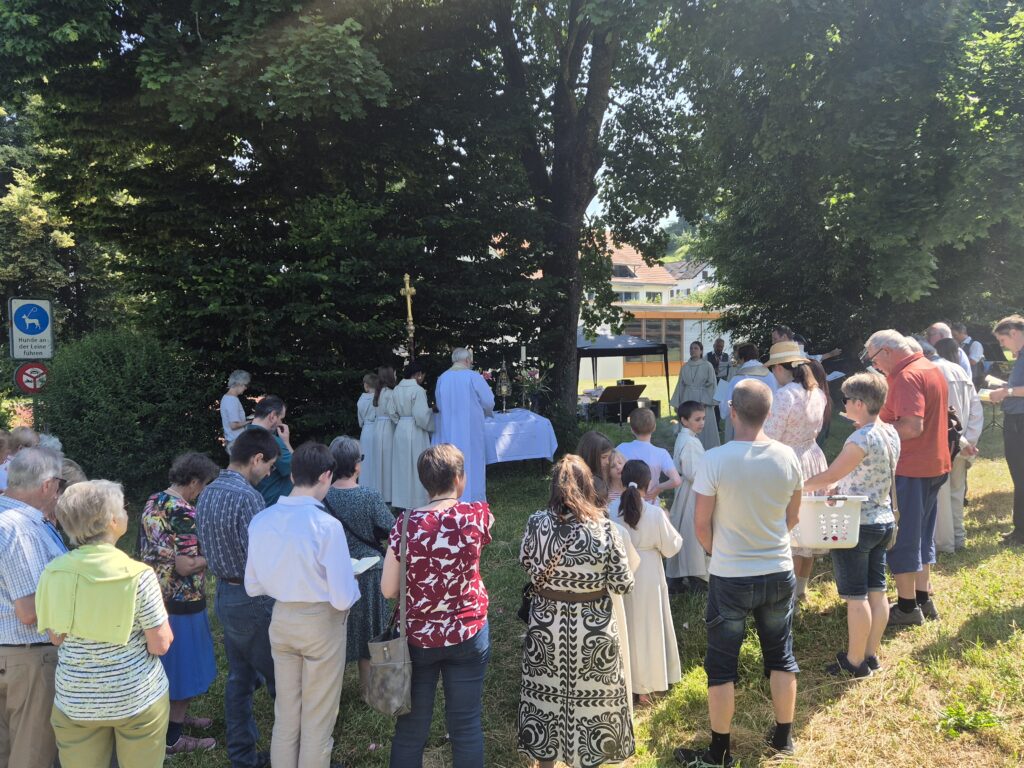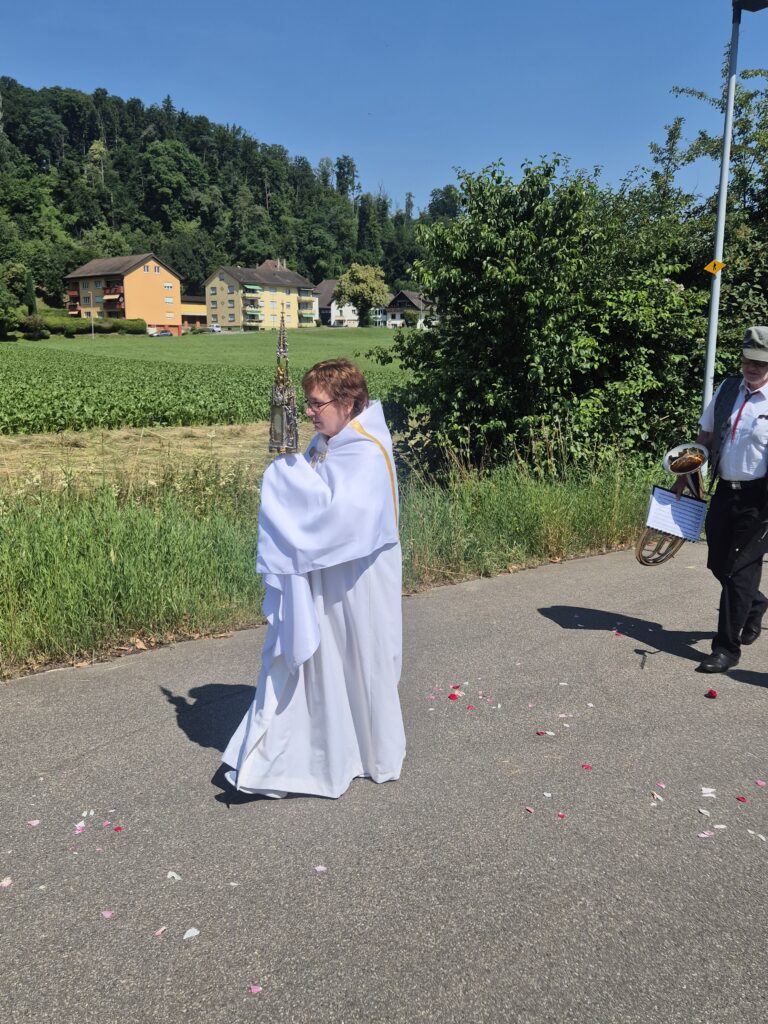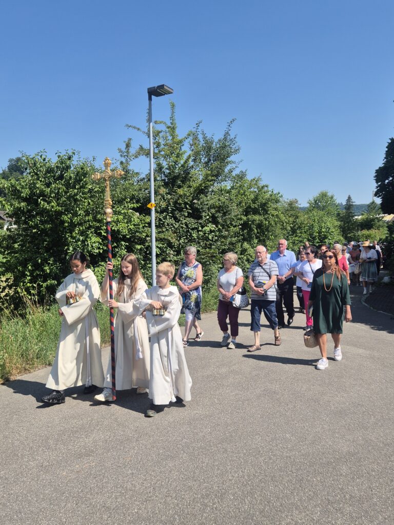 Gegen Ende des Gottesdienstes gab es nach langer Zeit wieder einmal eine Prozession, wo die Monstranz vom Schulhaus Chilewies durch Fisibach zur Kapelle St. Agatha getragen wurde, mit einem Zwischenhalt bei einem «Unterwegs»-Altar.