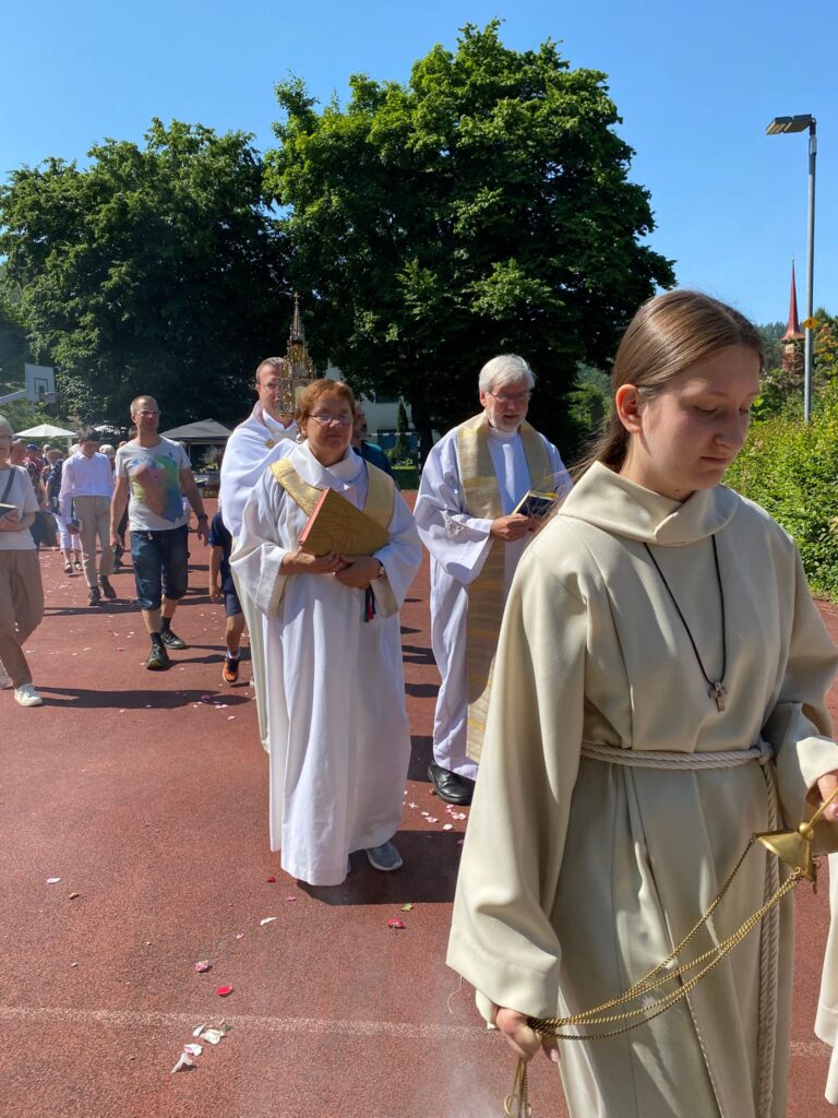 An Fronleichnam geht es um den Leib Christi. Das Fest erinnert an das letzte Abendmahl. Unsere Pastoralraumleiterin, Cordula Napieraj, erklärte in der Predigt worum es an Fronleichnam geht und weshalb es nach Pfingsten gefeiert wird.