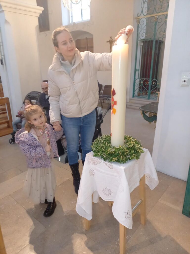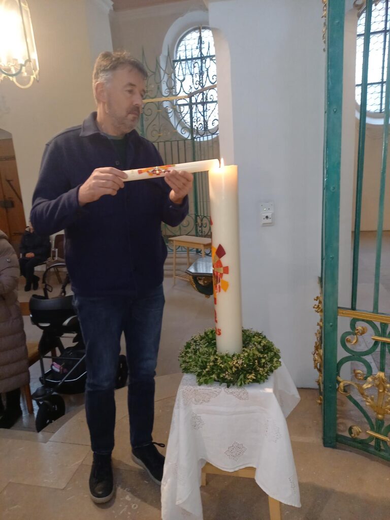 Mit dem fröhlichen Lied «Gottes Liebe ist so wunderbar» und einer passenden Lesung wurde die Feier fortgesetzt. Danach konnten die Familien noch einmal ihre Taufkerze an der Osterkerze entzünden. Bei gedämpftem Licht und brennenden Kerzen lauschten alle einem Segenswunsch und Gebet für ihre Kinder – ein Moment der Ruhe und Verbundenheit.